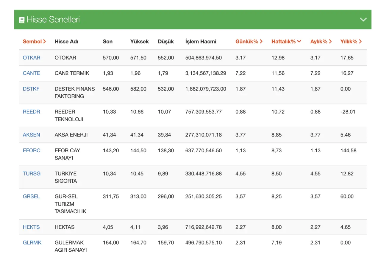 Borsa İstanbul’da 28 Temmuz – 1 Ağustos 2025 haftasında yatırımcısına en yüksek kazancı sağlayan hisseler belli oldu. Haftalık bazda en fazla prim yapan hisselerin başında OTOKAR, CAN2 Termik ve Destek Finans Faktoring geldi. En çok kazandıran hisseler ağırlıklı olarak savunma, enerji, finans, ulaştırma, tarım ve teknoloji sektörlerinden çıktı.