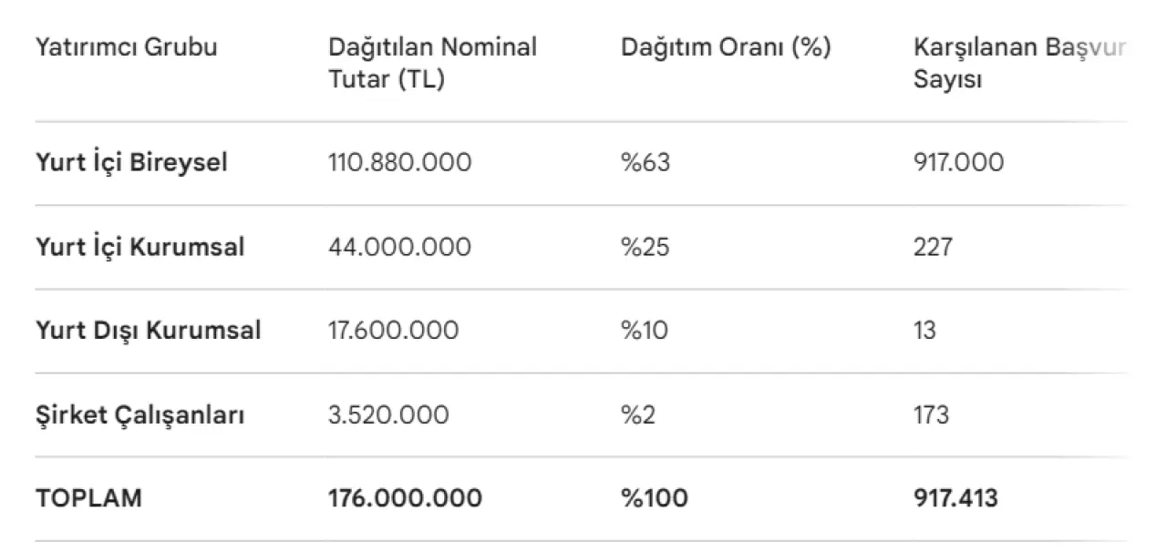 Halka arz sonuçlarına göre dağıtım yapılan yatırımcı sayısı ve miktarları şu şekilde gerçekleşti:
