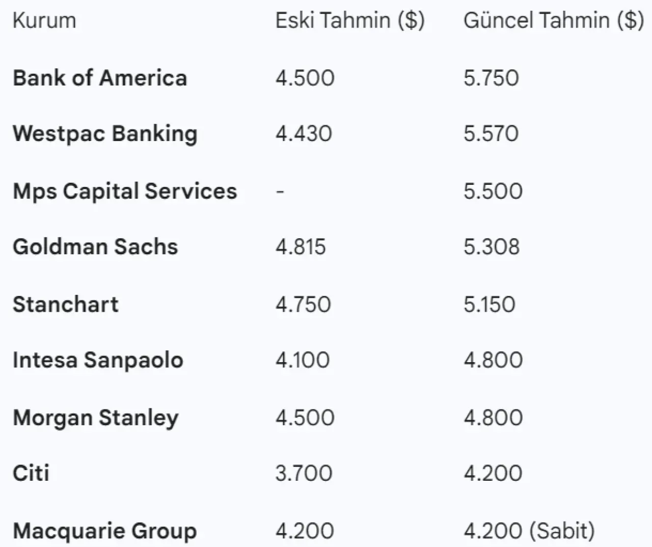 Bazı kurumlar ise piyasadaki dalgalanmaya rağmen mevcut beklentilerini koruyor. Citi, Ocak ayında 4 bin 200 dolara çıkardığı tahminini Şubat ayı sonu itibarıyla değiştirmedi. Benzer şekilde Stanchart 5 bin 150 dolar, Morgan Stanley ise 4 bin 800 dolar seviyesindeki beklentisini sürdürüyor. Macquarie Group ise 4 bin 200 dolarlık öngörüsüyle piyasanın en düşük beklentisine sahip kurumlarından biri olarak kalmaya devam ediyor.