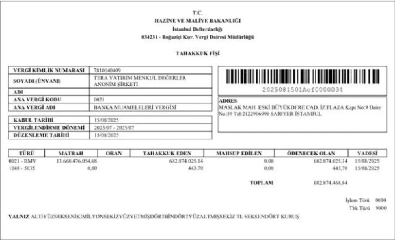 Tahakkuk fişinde yer alan vergi kodu 0021, yani Banka ve Sigorta Muameleleri Vergisi (BSMV). Bu vergi, aracı kurumların müşterileri üzerinden topladığı ve devlete aktardığı bir dolaylı vergidir. Yani Tera’nın kendi kârından ödediği bir yükümlülük değil, yalnızca aracılığını yaptığı bir tahsilattır. Buna rağmen, sosyal medyadaki sunum şekliyle sanki şirketin kârından yüz milyonlarca lira ödemiş gibi bir algı yaratılıyor.