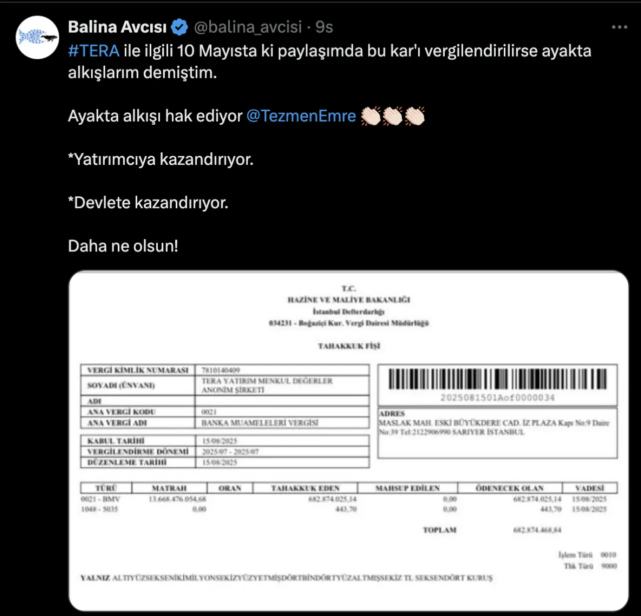 Borsa İstanbul’da yatırımcıların en çok takip ettiği sosyal medya hesaplarından biri olan Balina Avcısı, Tera Yatırım Menkul Değerler A.Ş.’nin vergi tahakkuk fişini paylaşarak gündem oldu. Paylaşımda, “yatırımcıya kazandırıyor, devlete kazandırıyor” ifadeleriyle şirket övüldü. Ancak işin arka planı incelendiğinde, paylaşılan belgenin kâr vergisi değil, müşterilerden tahsil edilen Banka ve Sigorta Muameleleri Vergisi (BSMV) olduğu anlaşıldı.