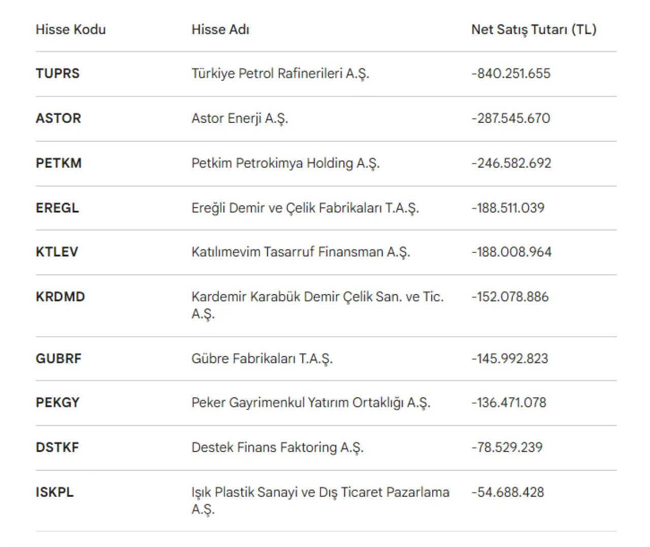 Matriks verilerine göre Bank of America üzerinden yapılan işlemlerde, satış tarafında liderliği açık ara farkla TÜPRAŞ (TUPRS) üstlendi. İşte 8 Nisan işlem gününde en çok net satış yapılan hisselerin listesi: