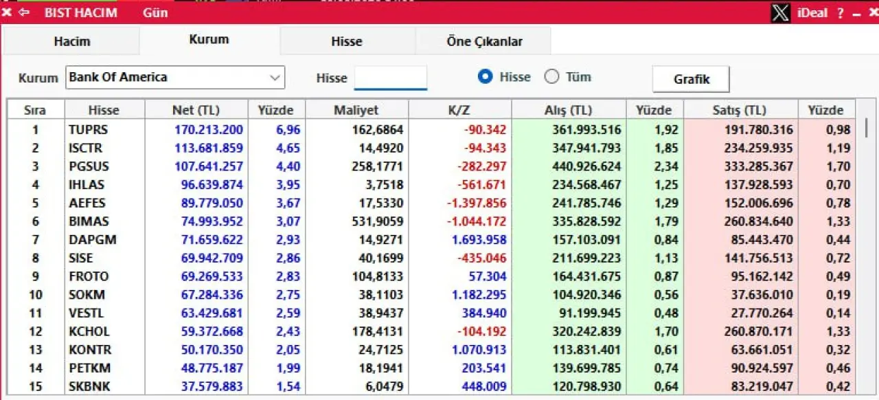 Listenin zirvesinde Tüpraş (TUPRS) yer aldı. 170,21 milyon TL net alımla günün en çok tercih edilen hissesi olan TUPRS, Bank of America’nın toplam işlem hacmi içinde önemli bir paya sahip oldu. Tüpraş’ı, İş Bankası (ISCTR) 113,68 milyon TL net alım ve Pegasus (PGSUS) 107,64 milyon TL net alımla takip etti.