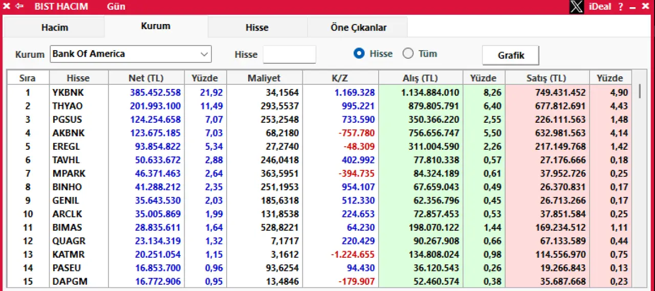 Pegasus (PGSUS) hissesi de yine tercih edilenler arasında yer aldı. Kurum, burada 124,2 milyon TL net alım yaptı. Gün içinde AKBNK, EREGL, TAVHL, MPARK ve BINHO gibi hisselerde de güçlü pozisyonlar kuruldu. Özellikle bankacılık sektörüne yönelimiyle dikkat çeken Bank of America, sanayi hisselerinde de seçici şekilde pozisyon aldı.