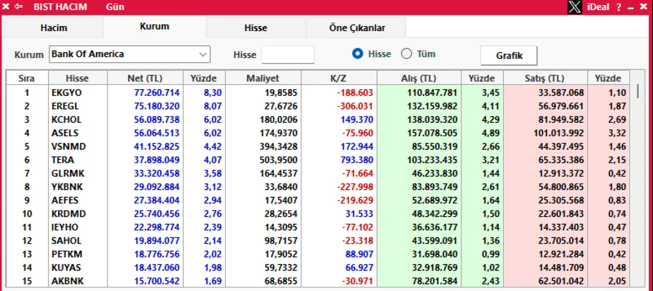 Günün verileri, Bank of America’nın farklı sektörlerdeki hisselerde yoğun pozisyon aldığını ve özellikle EKGYO ile EREGL’de yüksek net alımlar yaptığını ortaya koyuyor.