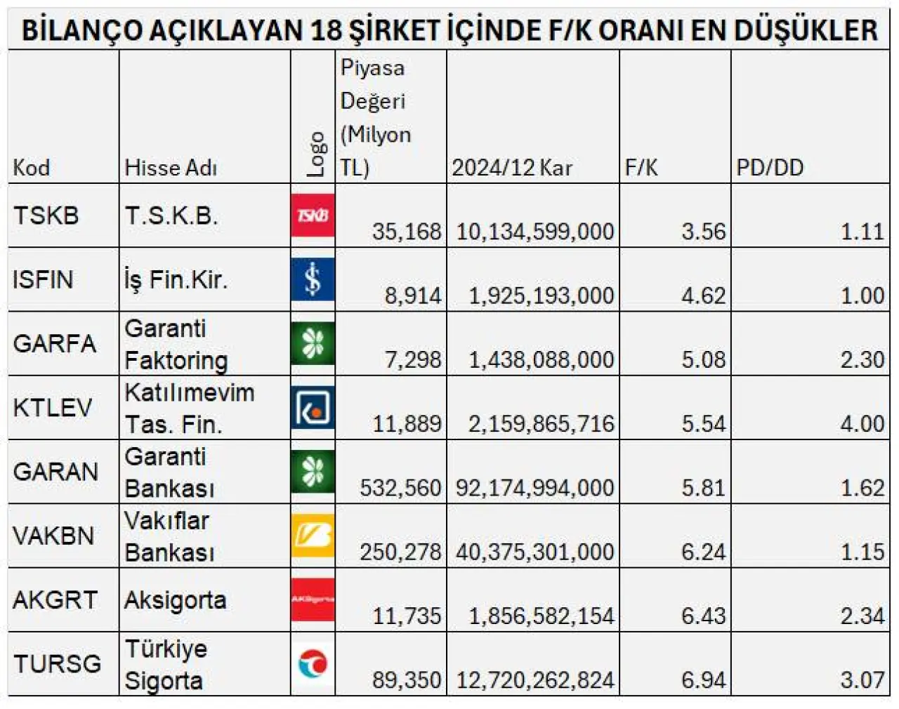 Büyük ölçekli şirketler arasında Garanti Bankası (GARAN) 5.81 F/K oranıyla dikkat çekerken, Vakıflar Bankası (VAKBN) ve Aksigorta (AKGRT) gibi finans kuruluşları da listede yer alıyor.