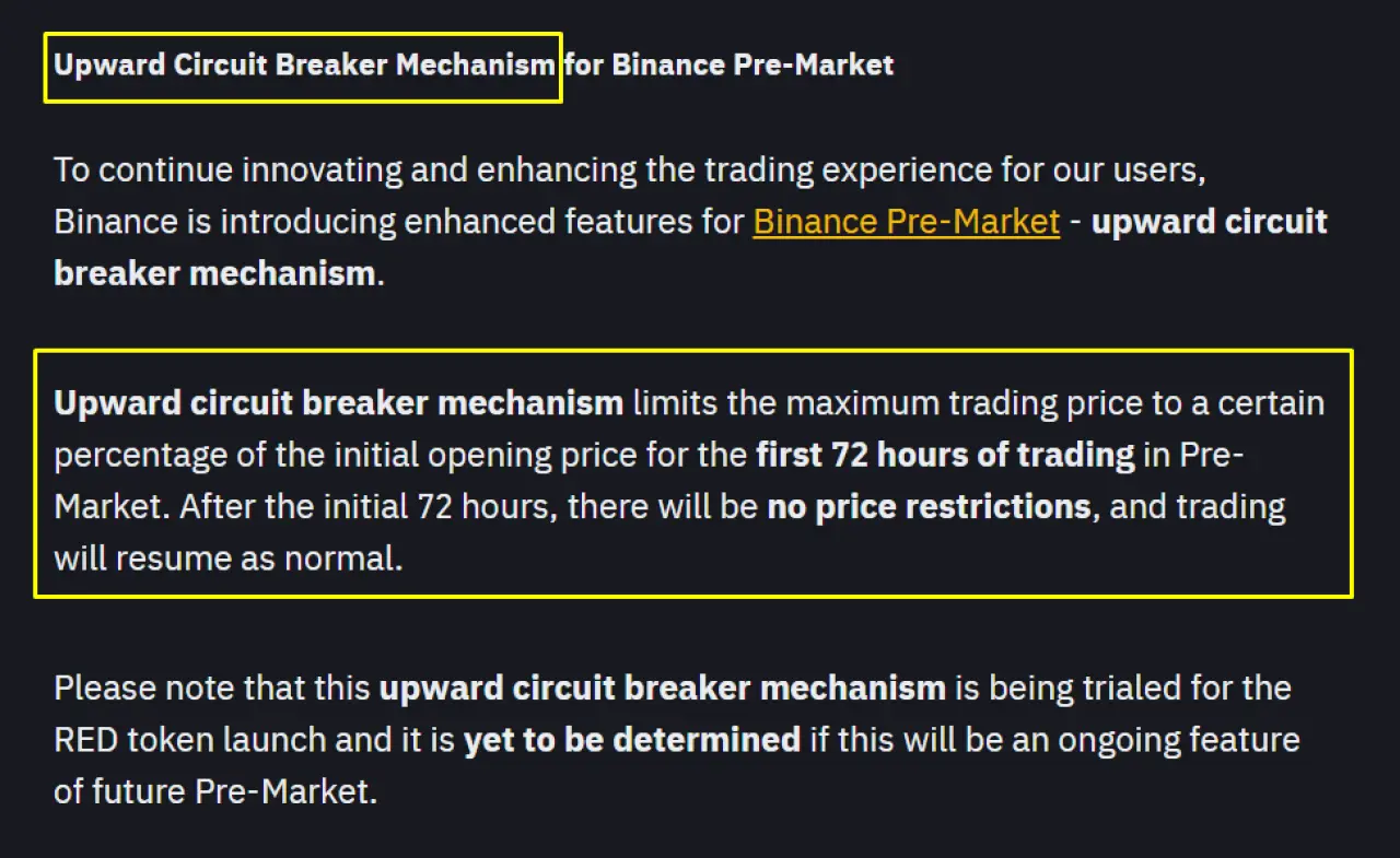 Binance, “Yukarı Yönlü Devre Kesici” uygulamasının $RED token lansmanı için deneneceğini ve bu özelliğin kullanılmaya devam edip etmeyeceğine dair henüz kesin bir karar alınmadığını belirtti.