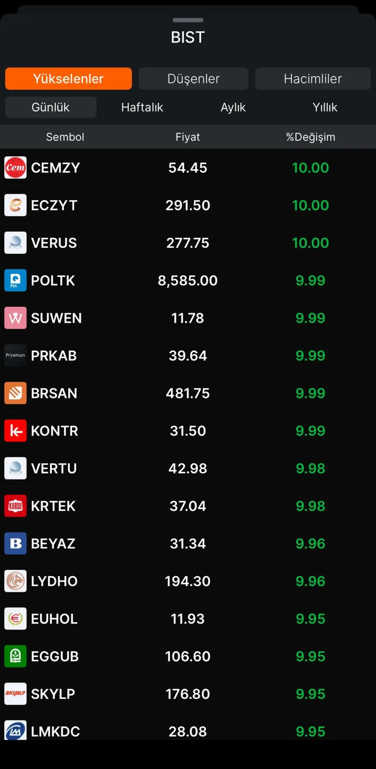 Günün en çok kazandıranları listesinde ilk üç sırayı CEMZY, ECZYT ve VERUS paylaştı. Her üç hisse de günü yüzde 10.00'lık tavan artışıyla kapatarak güçlü bir yükseliş trendi sergiledi. Bu şirketleri takiben, POLTK ve SUWEN de sırasıyla yüzde 9.99'luk artışlarla tavan fiyatlara yakın bir performans gösterdi. PRKAB, BRSAN ve KONTR gibi hisseler de yüzde 9.99'luk önemli yükselişlerle yatırımcıların ilgisini çekti.
