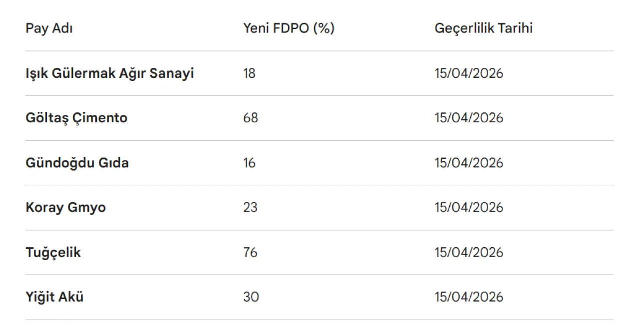 Borsa İstanbul A.Ş., Kamuyu Aydınlatma Platformu (KAP) üzerinden yaptığı duyuru ile 6 şirketin endekslerde dikkate alınan fiili dolaşımdaki pay oranlarında (FDPO) değişikliğe gidildiğini açıkladı. 15 Nisan 2026 tarihinden itibaren geçerli olacak bu değişiklikler, yatırımcıların takibinde yer alıyor.