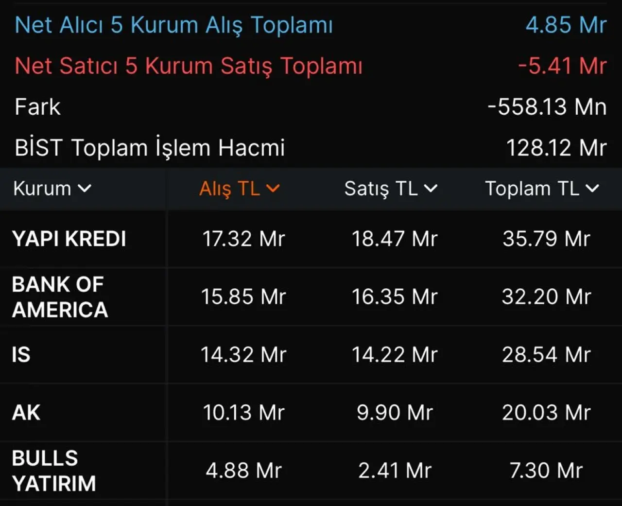 Günün genel seyrine bakıldığında, en çok işlem yapan ilk 5 aracı kurum arasında satıcıların daha baskın olduğu gözlemlendi. Net alıcı ilk 5 kurumun toplam alımları 4.85 Milyar TL seviyesinde kalırken, net satıcı ilk 5 kurumun toplam satışları 5.41 Milyar TL'ye ulaştı. Bu durum, piyasada -558.13 Milyon TL'lik net satıcı pozisyonuna işaret etti.