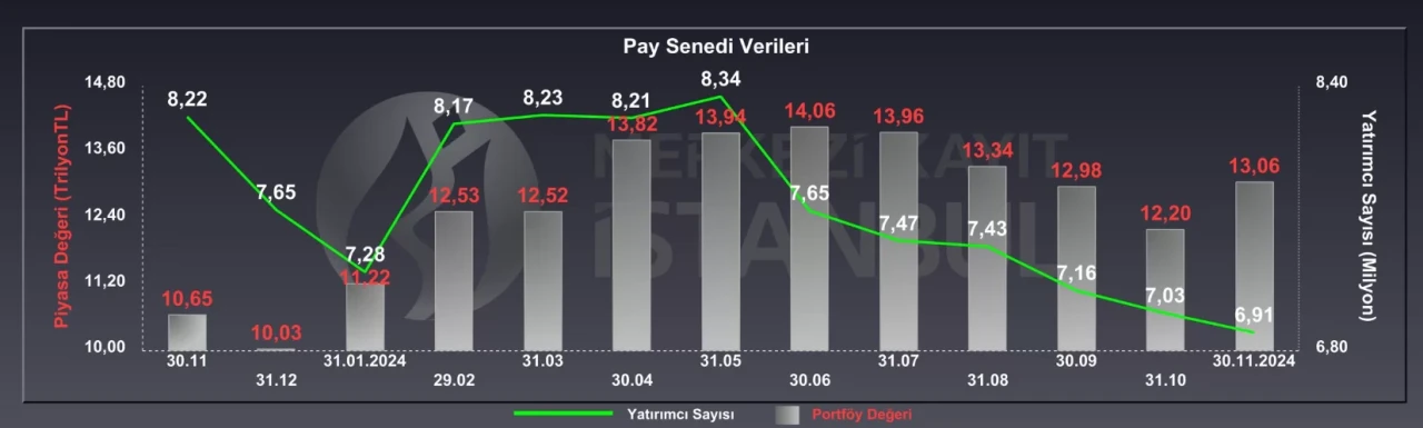 Türk sermaye piyasalarının merkezi saklama kuruluşu olarak faaliyet gösteren Merkezi Kayıt Kuruluşu (MKK), 1 Aralık 2024 tarihinde "MKK Piyasa Verileri" hakkında bir açıklama yaptı. Paylaşılan güncel verilere göre, pay senedi piyasasındaki yatırımcı sayısı haftalık bazda %0,39 oranında azalarak (27.398 kişi) 6.910.582'ye geriledi. Öte yandan, pay senedi piyasasının toplam portföy büyüklüğü 13,01 trilyon TL seviyesine ulaştı.