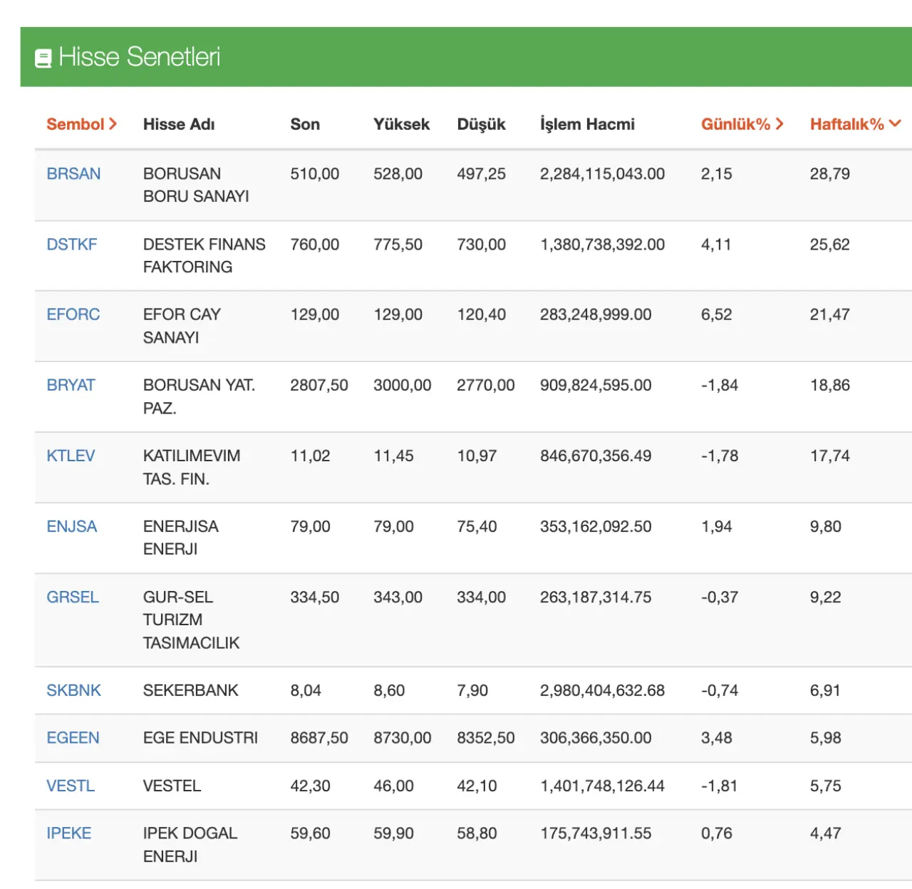 Haftanın en çok kazandıran hissesi Borusan Boru Sanayi (BRSAN) oldu. %28,79’luk yükseliş kaydeden BRSAN, haftayı 510,00 TL seviyesinden kapatarak yatırımcısına yüksek kazanç sağladı. Borusan Grubu’nun diğer şirketi Borusan Yatırım Pazarlama (BRYAT) da %18,86’lık primle dikkat çekti. Böylece Borusan çatısı altındaki iki şirket, haftanın en fazla kazandıranları arasına girmeyi başardı.