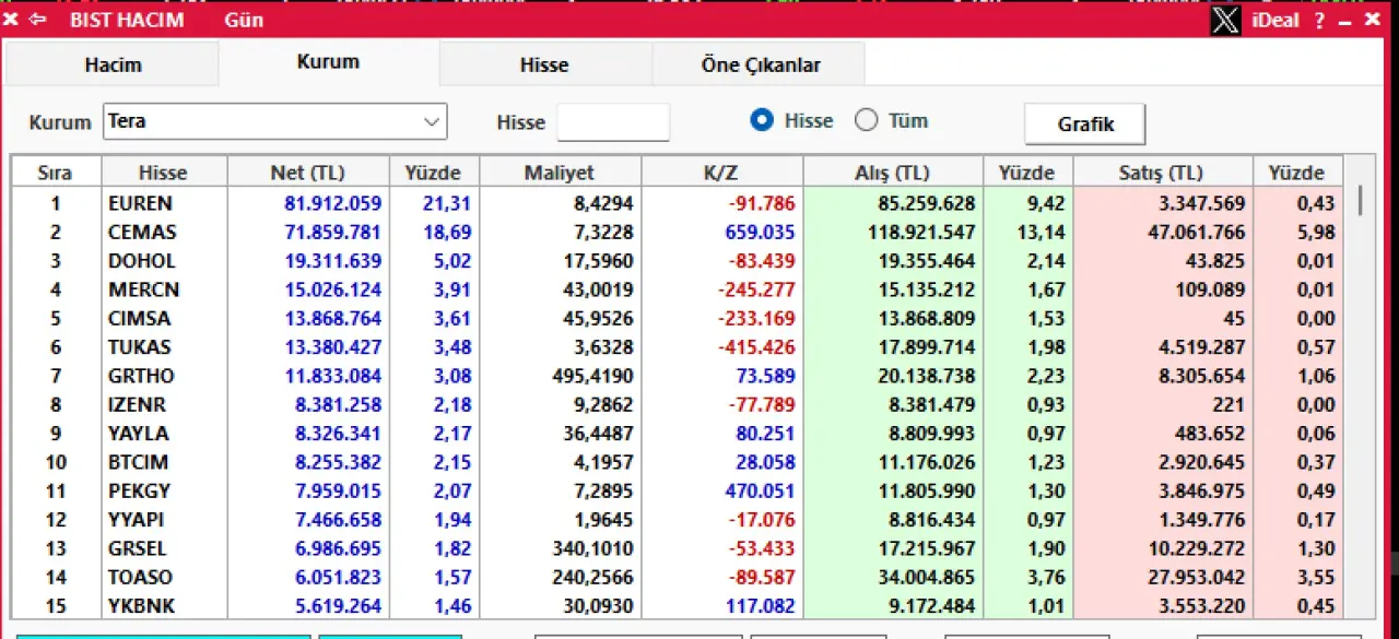 Borsa İstanbul'da (BIST) BIST 100 endeksi, geçtiğimiz haftadan beri sürdürdüğü düşüş eğiliminin ardından bugün yükselişe geçti. Gün içinde 10.431 ile 10.594 puan arasında işlem gören endeksin bu yükselişi, piyasalarda hareketliliği artırdı. Bu hareketlilikte, Tera Yatırım Menkul Değerler A.Ş.'nin Borsa İstanbul'da gerçekleştirdiği günlük işlemler dikkat çekici veriler ortaya koydu.
