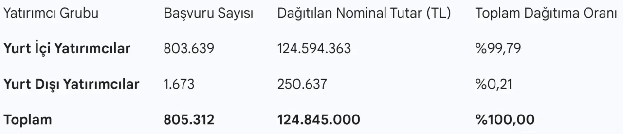 Halka arzda en büyük payı yurt içi bireysel yatırımcılar alırken, kurumsal yatırımcıların dağıtımdaki oranı sınırlı kaldı.