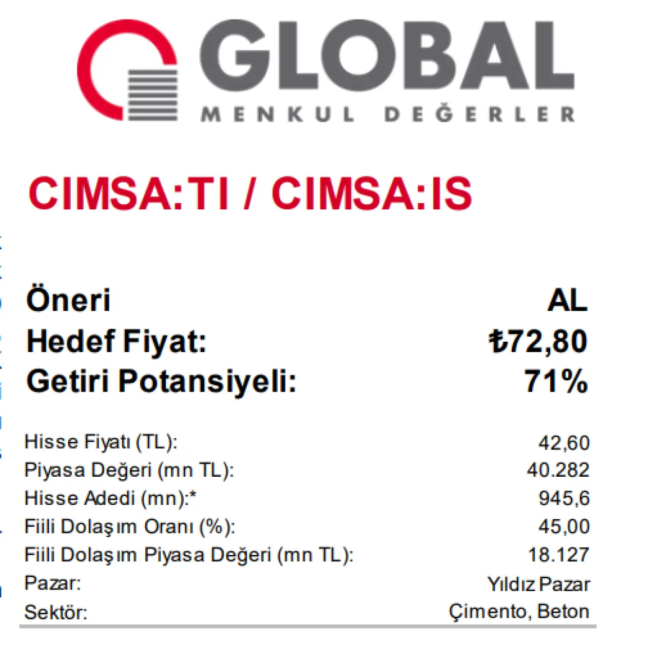 Bu doğrultuda, Çimsa için 12 aylık hedef fiyat 72,80 TL olarak belirlendi. Bu hedef, mevcut hisse fiyatı olan 42,60 TL'ye göre yüzde 71'lik cazip bir artış potansiyeline işaret ediyor. Global Menkul Değerler, bu güçlü görünüme dayanarak CIMSA için "AL" tavsiyesini sürdürdü.