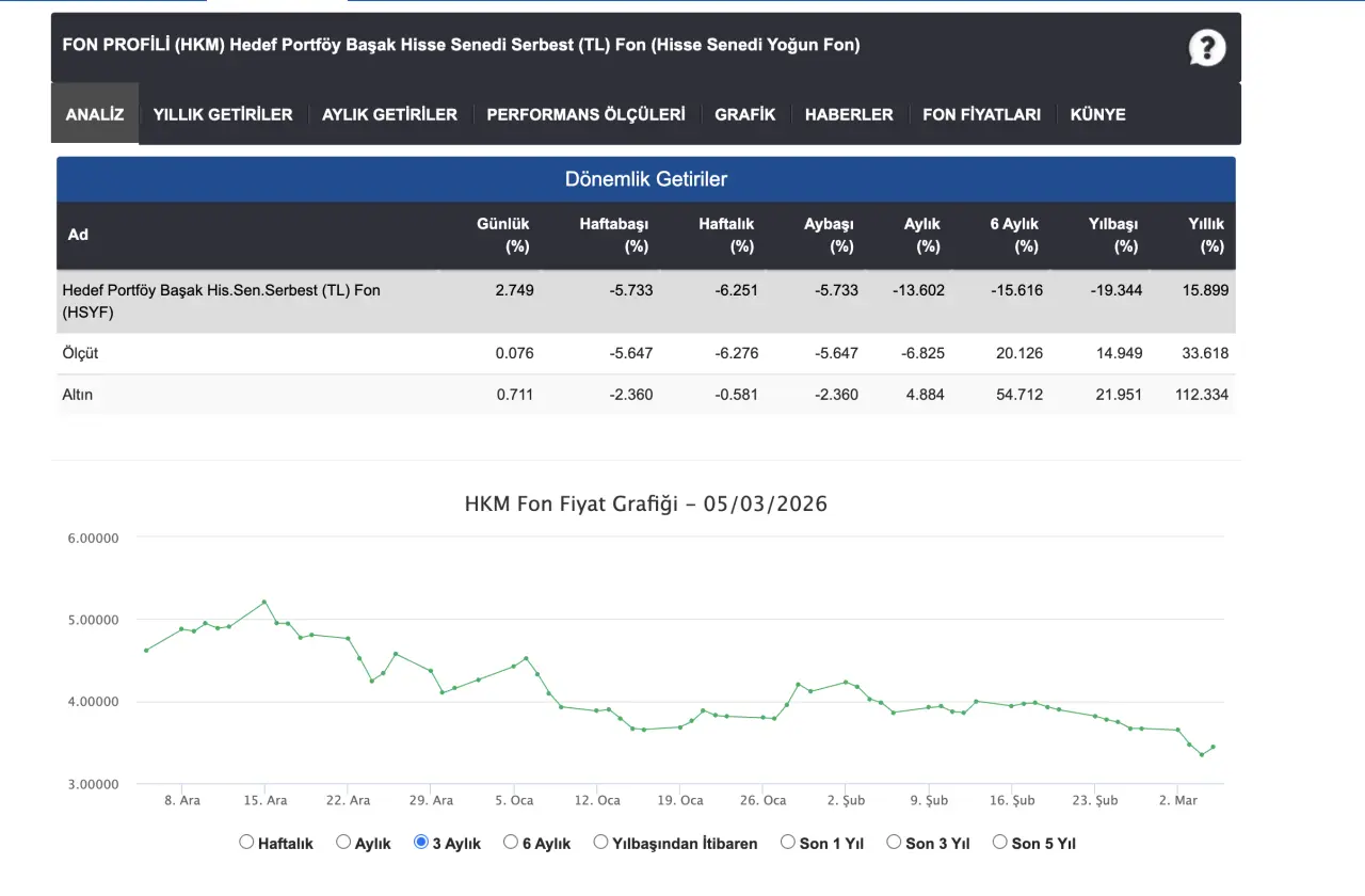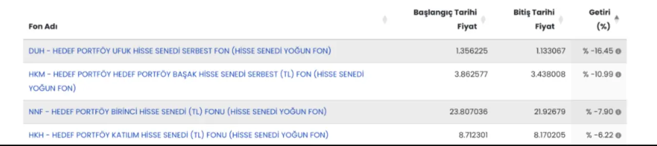 Bir diğer fon olan HKM – Hedef Portföy Başak Hisse Senedi Serbest (TL) Fon, aynı dönemde %-10,99 getiri ile çift haneli kayıp yaşayan fonlar arasında yer aldı.