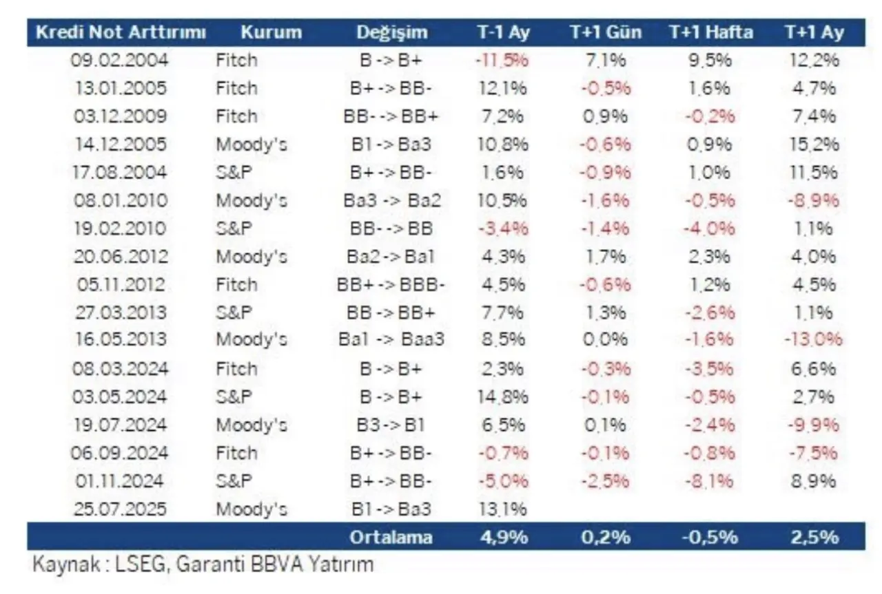 Kredi derecelendirme kuruluşları arasında en çok dikkate alınanlardan biri olan Moody's’in Türkiye’ye ilişkin not artırımları, Borsa İstanbul üzerinde tarihsel olarak güçlü fiyatlamalara yol açtı. Garanti BBVA Yatırım ve LSEG verilerine göre, Moody’s kaynaklı not artışlarının ardından BIST 100 endeksi genellikle pozitif tepki verdi. Özellikle not artışı sonrası 1 aylık performanslar, diğer kredi kuruluşlarına kıyasla oldukça dikkat çekici.