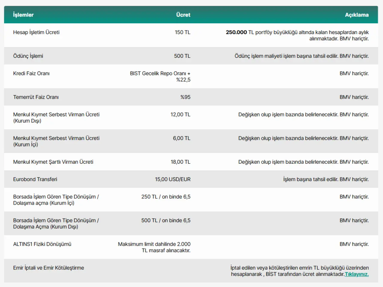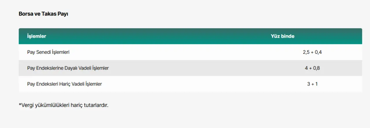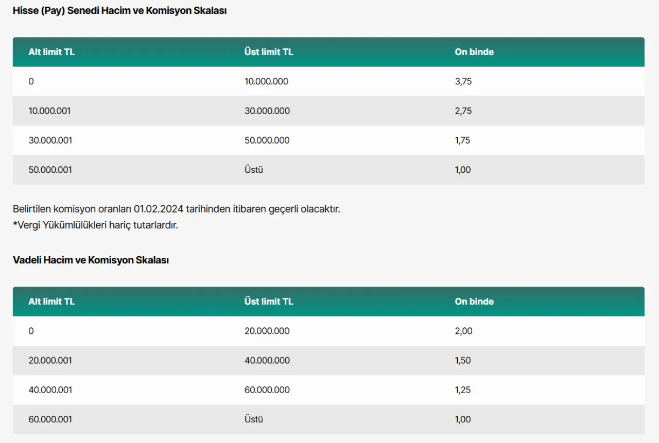 Yatırımcılarımıza uygulanan skalalı komisyon oranlarımız hisse (pay) senedi işlemleri için maksimum on binde 3,75; vadeli sözleşmeleri için maksimum on binde 2,00’tir.