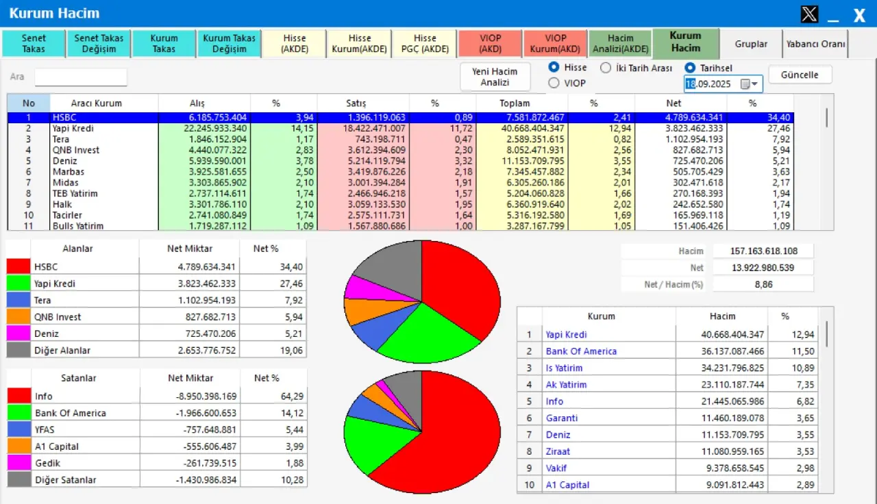 Piyasada alıcı ve satıcı dengesinin hangi aracı kurumlar tarafından belirlendiğini gösteren net hacim verileri de açıklandı. Buna göre, en çok net alım yapan kurumlar sırasıyla HSBC (4.789.634.341 TL), Yapı Kredi (3.823.462.333 TL) ve QNB Finans (1.102.954.193 TL) oldu. Bu kurumların pozitif net hacimleri, alım yönlü işlemlerin güçlü olduğunu gösteriyor.