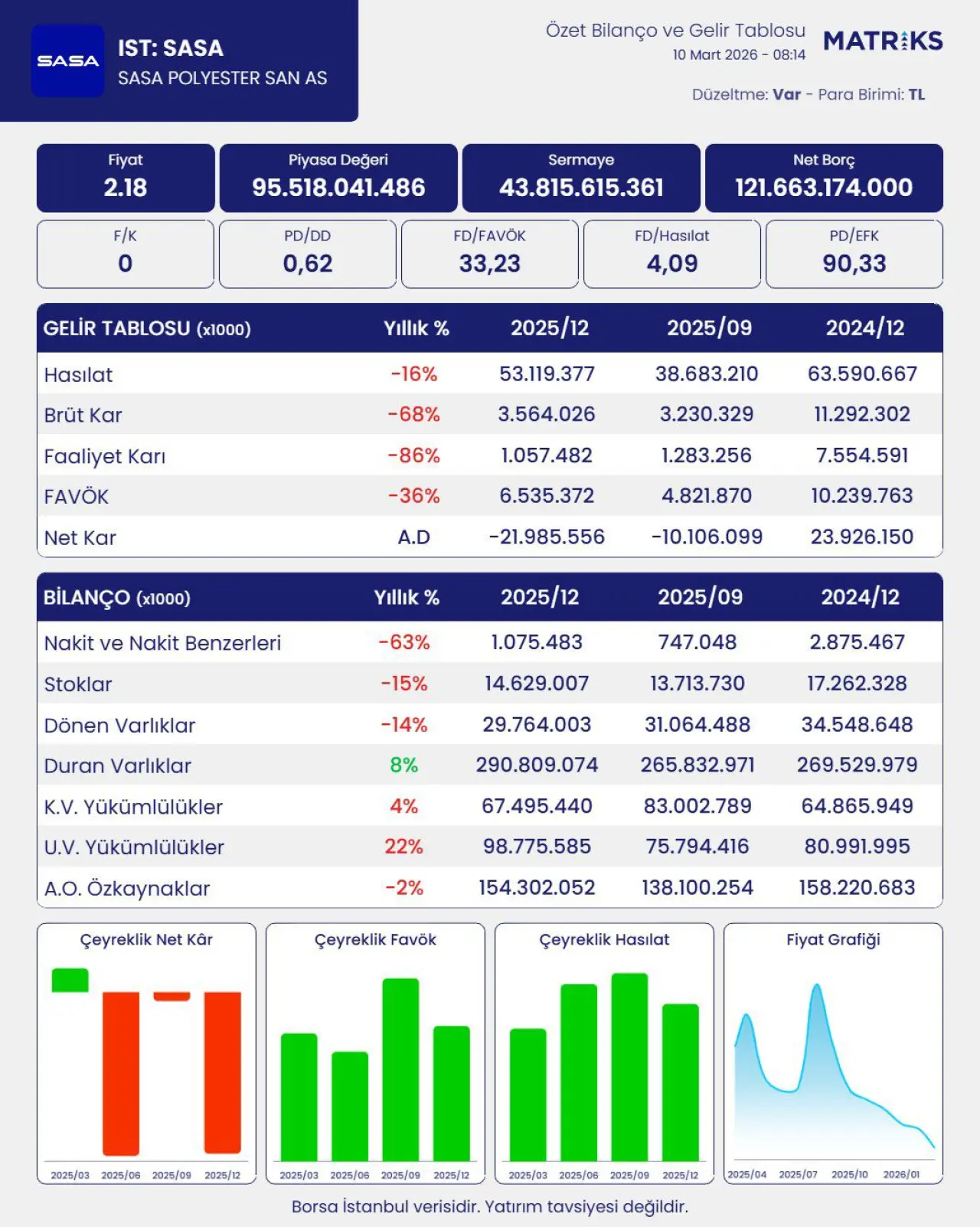 Güncel verilere göre Sasa Polyester’in Piyasa Değeri 95,5 milyar TL seviyesinde bulunuyor. Fiyat kazanç (F/K) oranı zarar nedeniyle "0" olarak kaydedilirken, Piyasa Değeri / Defter Değeri (PD/DD) oranı 0,62 ile dikkat çekiyor. PD/EFK (Esas Faaliyet Kârı) oranının 90,33 gibi yüksek bir seviyede olması, operasyonel kârlılığın piyasa değerine oranla oldukça zayıf kaldığını kanıtlıyor.