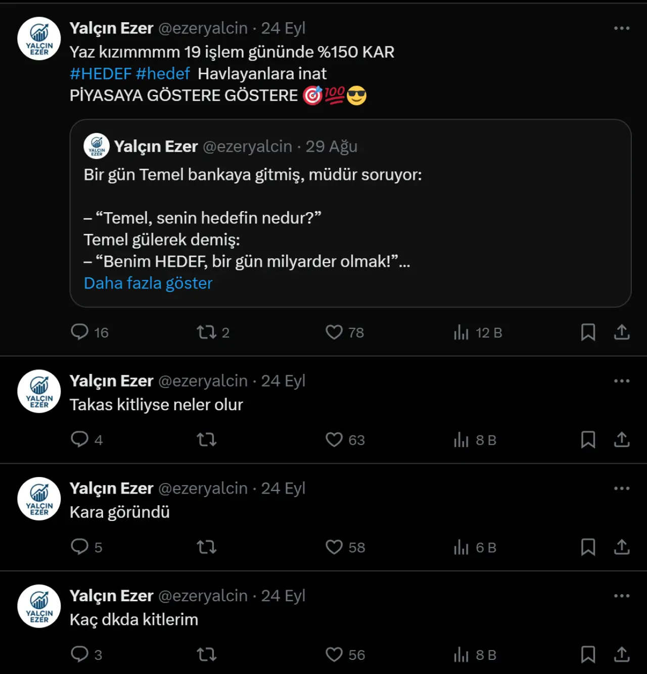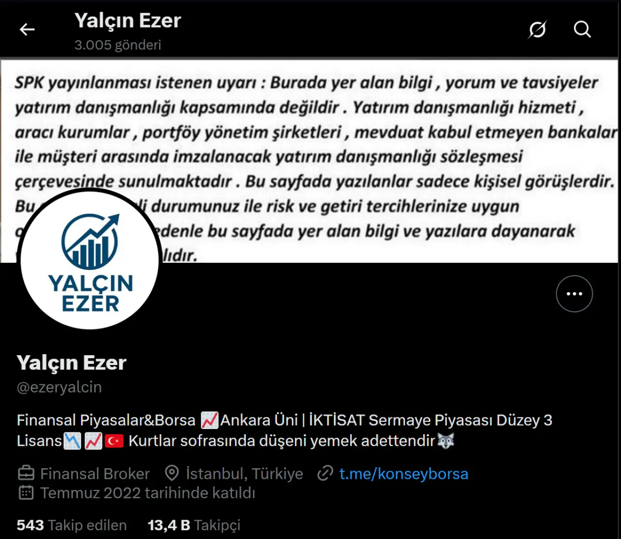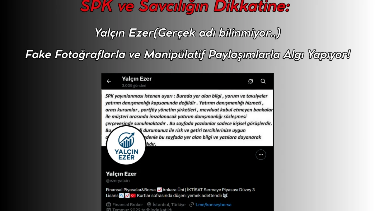 Sosyal medyada “borsa uzmanı” kimliğiyle dikkat çeken Yalçın Ezer (@ezeryalcin) hakkında yeni iddialar gündeme geldi. Daha önce Instagram’dan alınan başkasına ait fotoğrafları kullanarak algı yarattığı ortaya çıkan hesabın, bu kez de borsa manipülasyonu içeren söylemlerle yatırımcıları etkilediği görülüyor.