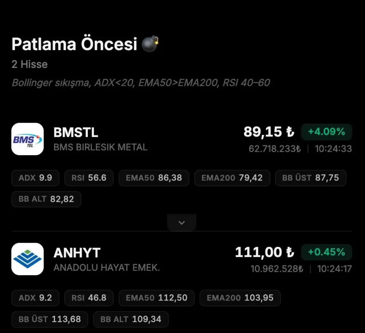 Teknik analistlerin yakından takip ettiği bazı sinyal kombinasyonları, belirli hisselerin kırılım öncesi bir sessizlik dönemine girdiğine işaret ediyor. Borsa İstanbul'da bu kriterlerle öne çıkan iki hisse BMSTL (BMS Birleşik Metal) ve ANHYT (Anadolu Hayat Emeklilik) oldu.