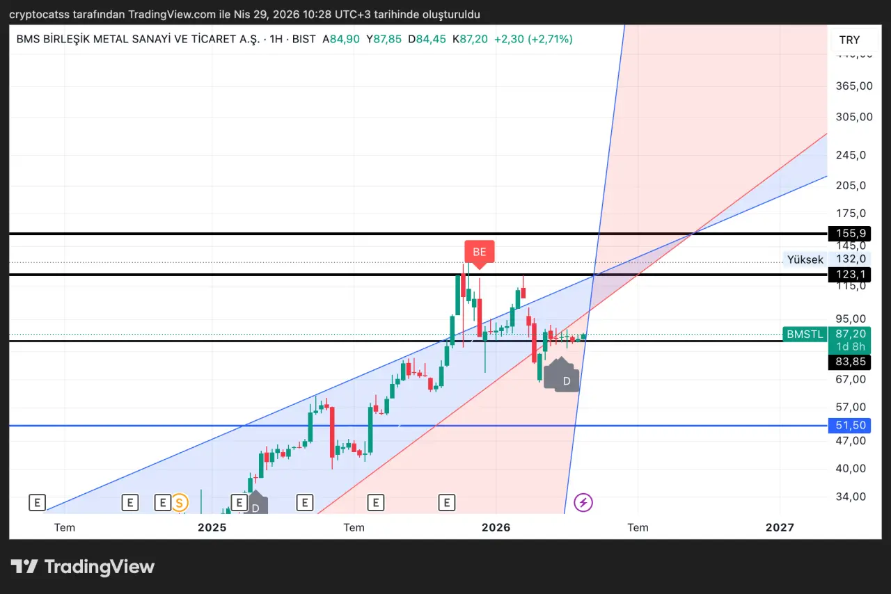 BMS Birleşik Metal hisseleri 89,15 TL seviyesinde işlem görürken günlük yüzde 4,09 değer kazandı. ADX 9,9 ile aşırı düşük bir trend gücüne işaret ederken, RSI 56,6 ile nötr-pozitif bölgede bulunuyor. EMA50 (86,38) EMA200'ün (79,42) belirgin şekilde üzerinde yer alıyor. Bollinger Bandı üst sınırı 87,75, alt sınırı ise 82,82 olarak hesaplandı; fiyatın bandın dışına çıkması halinde sert bir hareket gündeme gelebilir.