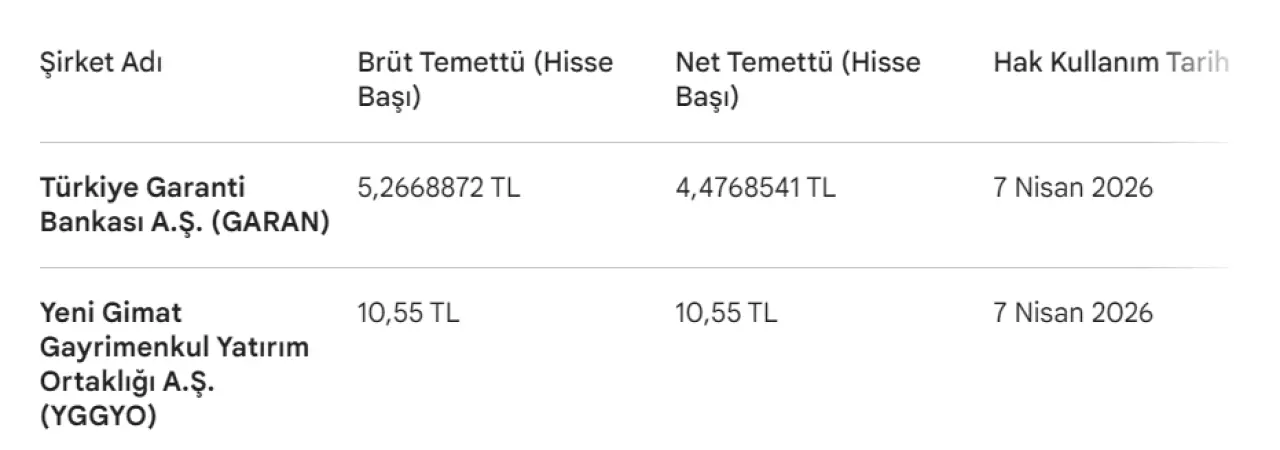 Borsa İstanbul’da işlem gören halka açık şirketlerin kâr paylaşım süreci kapsamında, Türkiye Garanti Bankası ve Yeni Gimat Gayrimenkul Yatırım Ortaklığı hak kullanım tarihlerini başlattı.