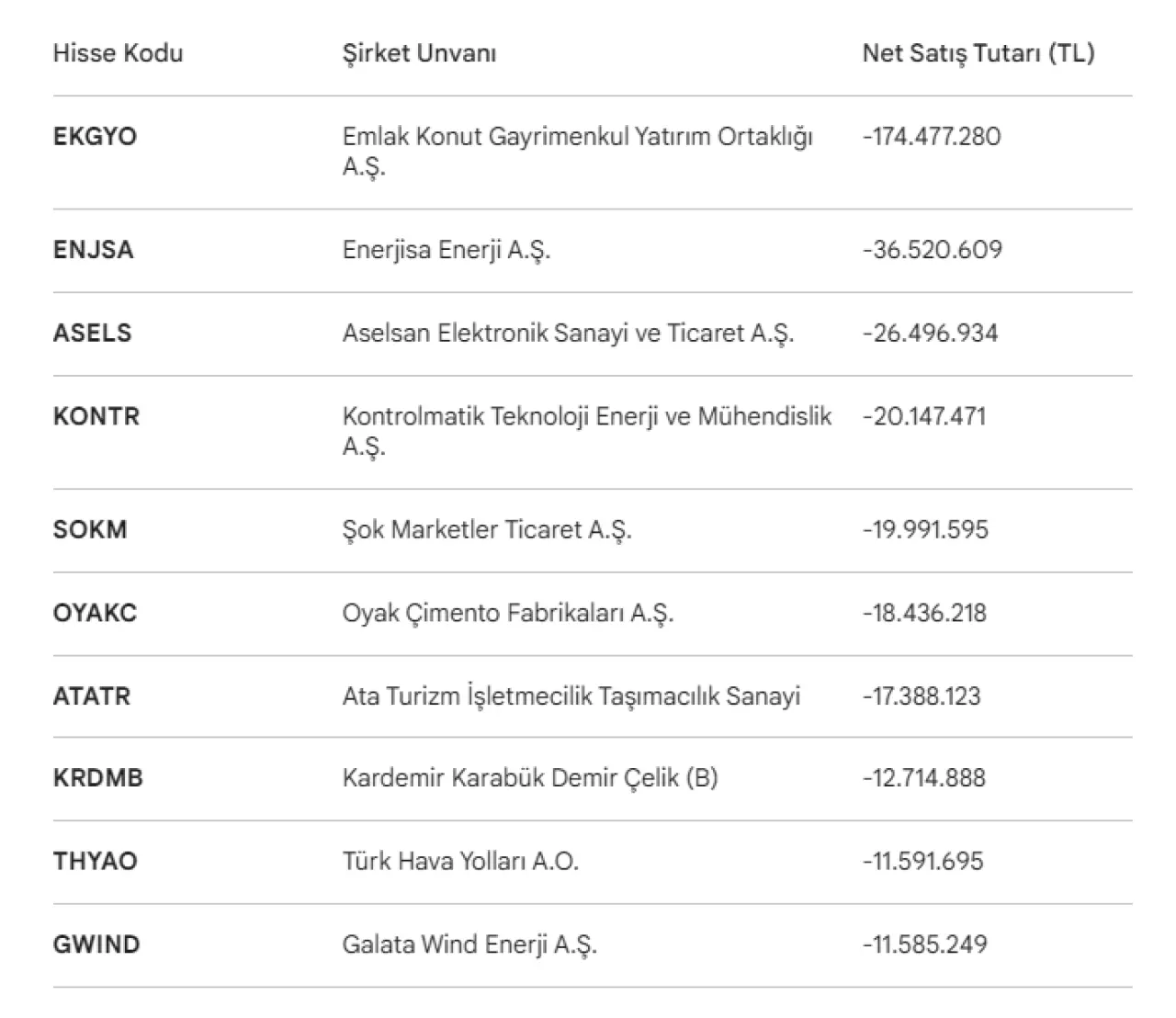 Tera Yatırım üzerinden yapılan işlemlerde genel tablo alım ağırlıklı olsa da (3,823 milyar TL net alım), belirli hisselerde yüklü satışlar gerçekleşti. İşte Tera Yatırım müşterilerinin 20 Nisan tarihinde en çok elden çıkardığı hisseler ve net satış hacimleri: