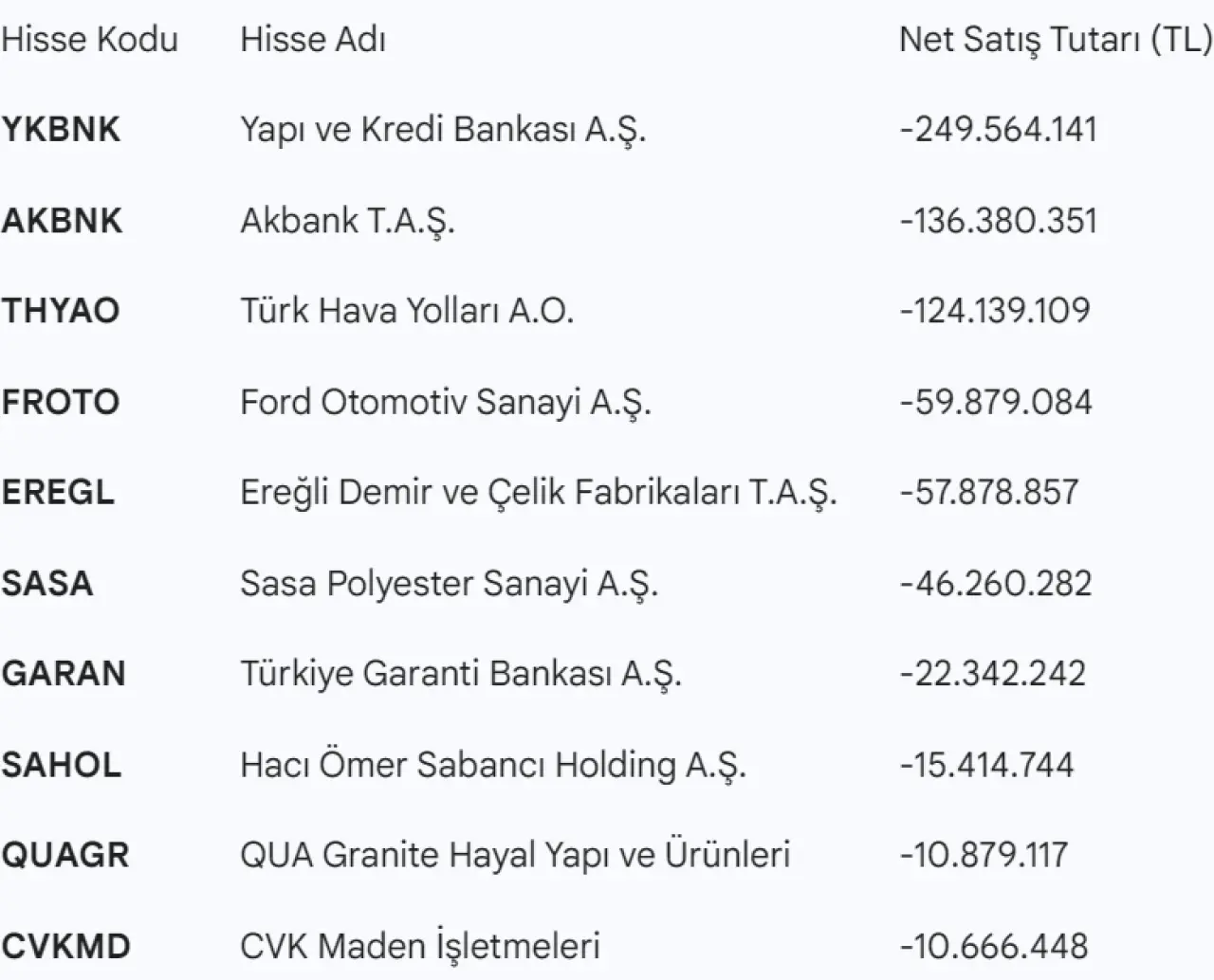 Matriks verilerine göre, 22 Ocak Perşembe günü Tera Yatırım aracılığıyla en fazla satış yapılan 10 hisse ve net hacimleri şu şekilde gerçekleşti: