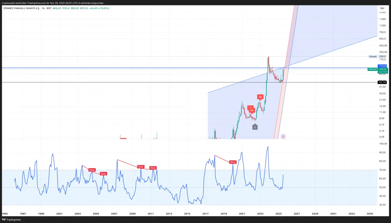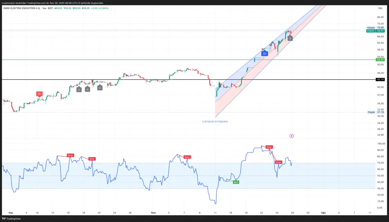 Hızlı ve hacimli yükseliş, spekülatif bir ilginin göstergesi. RSI’ın aşırı alım bölgesinde kalması dikkat çekici. Bu noktadan sonra yeni alım yerine stoplu trade mantığıyla hareket etmek daha sağlıklı olacaktır.