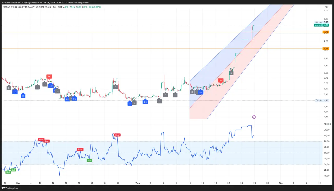 4,90 ₺ seviyesinden başlayan sert çıkış, 8,15 ₺ seviyesinde şimdilik dirençle karşılaşmış gibi.