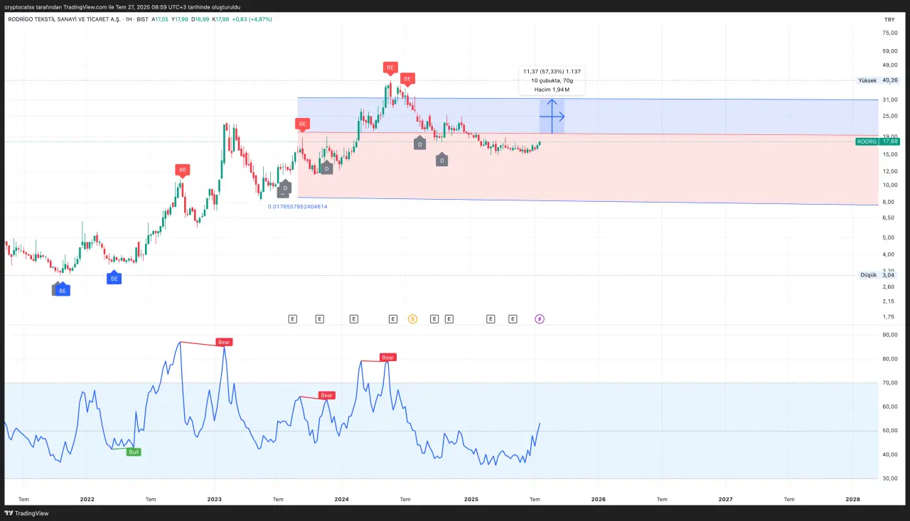 Geçtiğimiz yılın en çok konuşulan hisselerinden biri olan RODRG, uzun süredir yatay bantta sürdürdüğü hareketin ardından teknik olarak dipten dönüş sinyalleri veriyor.