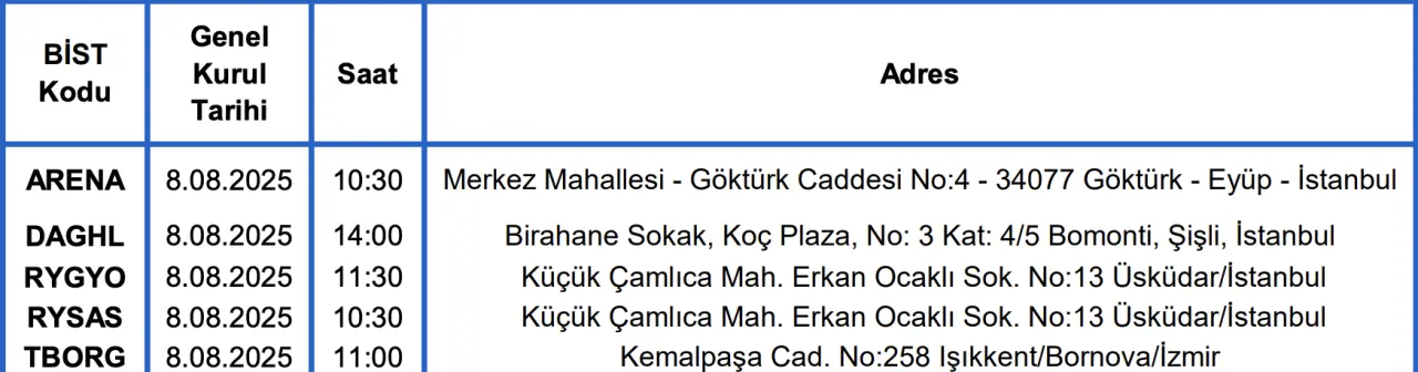 Borsa İstanbul’da işlem gören beş şirket, 8 Ağustos 2025 Cuma günü olağan genel kurul toplantılarını gerçekleştirecek. Yatırımcılar açısından büyük önem taşıyan bu toplantılarda, 2024 yılı faaliyet raporları, finansal tablolar, kâr dağıtım politikaları, yönetim kurulu seçimleri ve şirket stratejilerine ilişkin önemli kararlar alınacak.