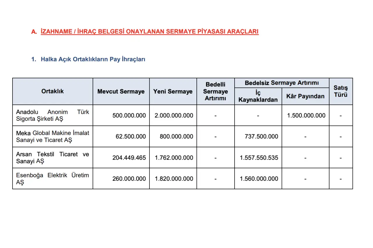 Sermaye Piyasası Kurulu (SPK), dört halka açık şirketin bedelsiz sermaye artırımı başvurularını onayladı. Karara göre yatırımcılar, ellerindeki hisselere karşılık yüksek oranlarda bedelsiz pay alacak.