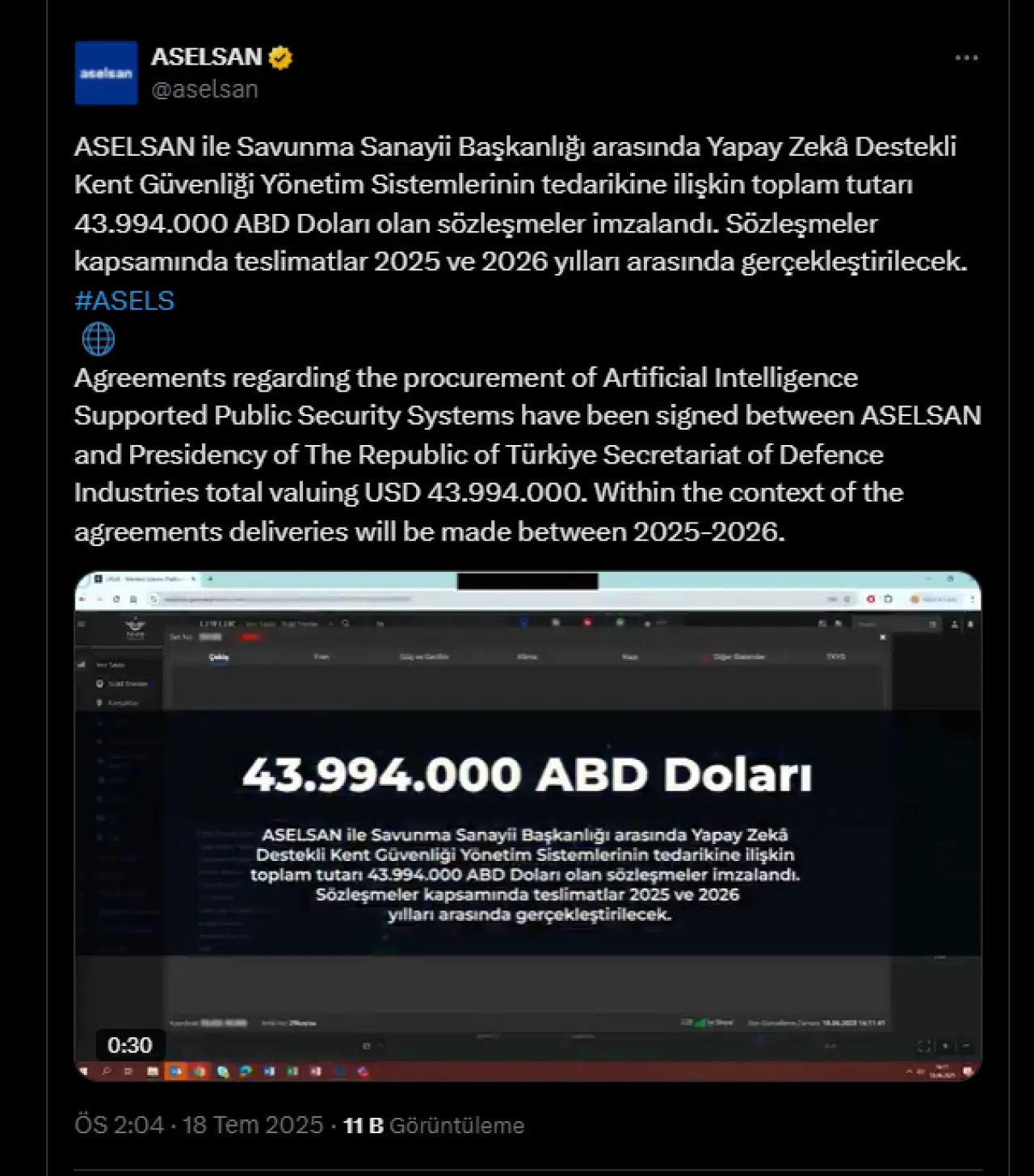 ASELSAN ile Savunma Sanayii Başkanlığı arasında Yapay Zekâ Destekli Kent Güvenliği Yönetim Sistemlerinin tedarikine ilişkin toplam tutarı 43.994.000 ABD Doları olan sözleşmeler imzalandı. Sözleşmeler kapsamında teslimatlar 2025 ve 2026 yılları arasında gerçekleştirilecek.