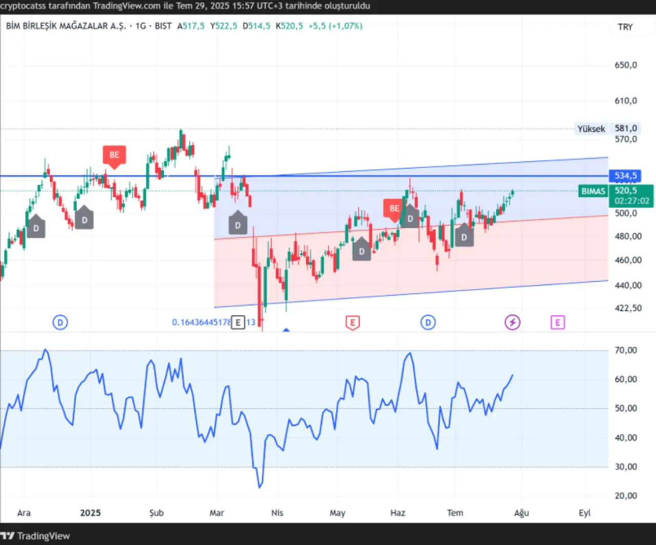 BİM Birleşik Mağazalar A.Ş. (BIMAS), 29 Temmuz 2025 tarihli işlemlerde %1,07 yükselişle 520,5 TL seviyesine ulaştı. Hisse, mart ayından bu yana içinde hareket ettiği yükselen kanal yapısını koruyarak teknik görünümde pozitif sinyaller üretmeye devam ediyor. Grafik üzerinde 534,5 TL seviyesi hem kanalın üst bandı hem de kısa vadeli direnç bölgesi olarak öne çıkmakta.