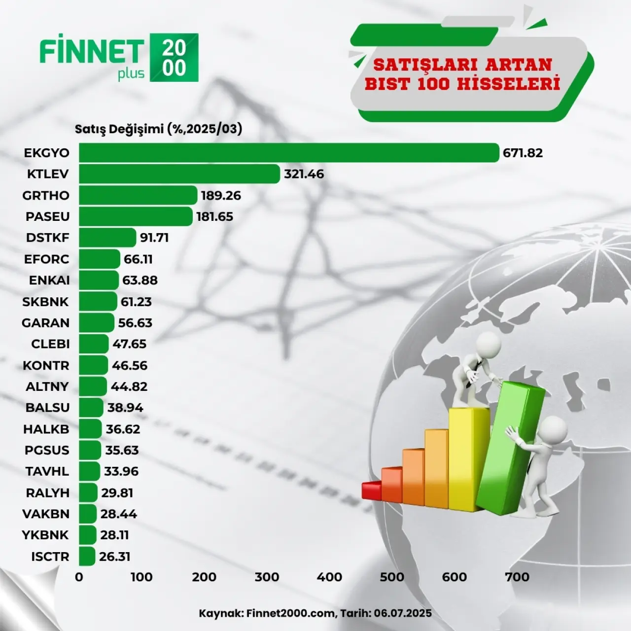 Borsa İstanbul’da işlem gören BIST 100 şirketlerinin 2025 yılı Mart dönemi satış verileri belli oldu. Finnet2000 verilerine göre satış gelirlerini önceki yılın aynı dönemine kıyasla en çok artıran şirket Emlak Konut GYO (EKGYO) olurken, onu Katılım Evim (KTLEV) ve Girişim Elektrik (GRTHO) takip etti.