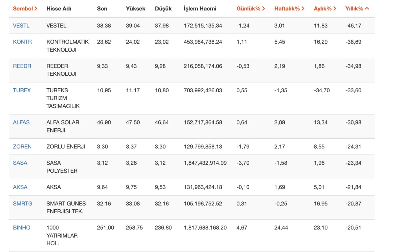 27 Temmuz 2025 itibarıyla yıllık bazda en fazla düşüş yaşayan 10 hisse senedi belli oldu. Listenin başını, beyaz eşya ve elektronik sektörünün önde gelen temsilcilerinden Vestel (VESTL) çekiyor. Hisse fiyatı son bir yılda %46,17 oranında geriledi. İç pazarda satışların yavaşlaması, ihracatta marj baskısı ve döviz kaynaklı maliyetler Vestel’i olumsuz etkiledi. Listenin ikinci sırasında, enerji ve savunma teknolojilerinde öne çıkan Kontrolmatik Teknoloji (KONTR) yer alıyor. 2024’te agresif büyüme hikâyesiyle öne çıkan şirket, 2025’te hem proje finansmanında hem de nakit akışlarında yaşanan daralmayla yatırımcısına %38,69 zarar yazdırdı.