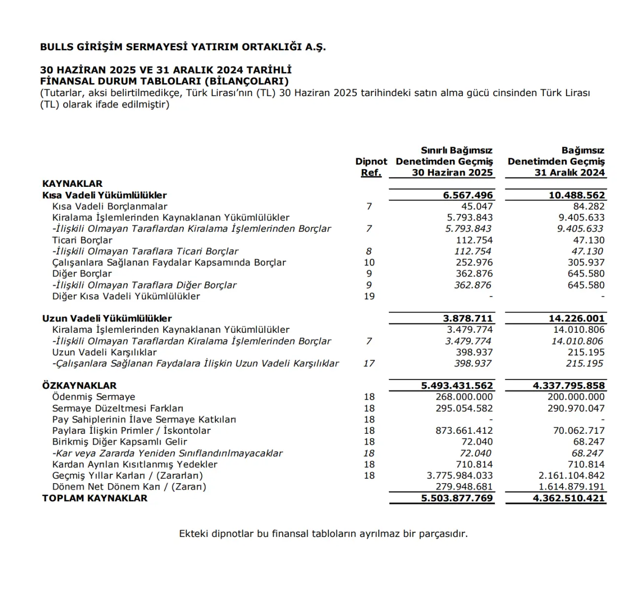 Toplam özkaynaklar: 5 milyar 493 milyon TL (2024 yıl sonuna göre %26 artış)