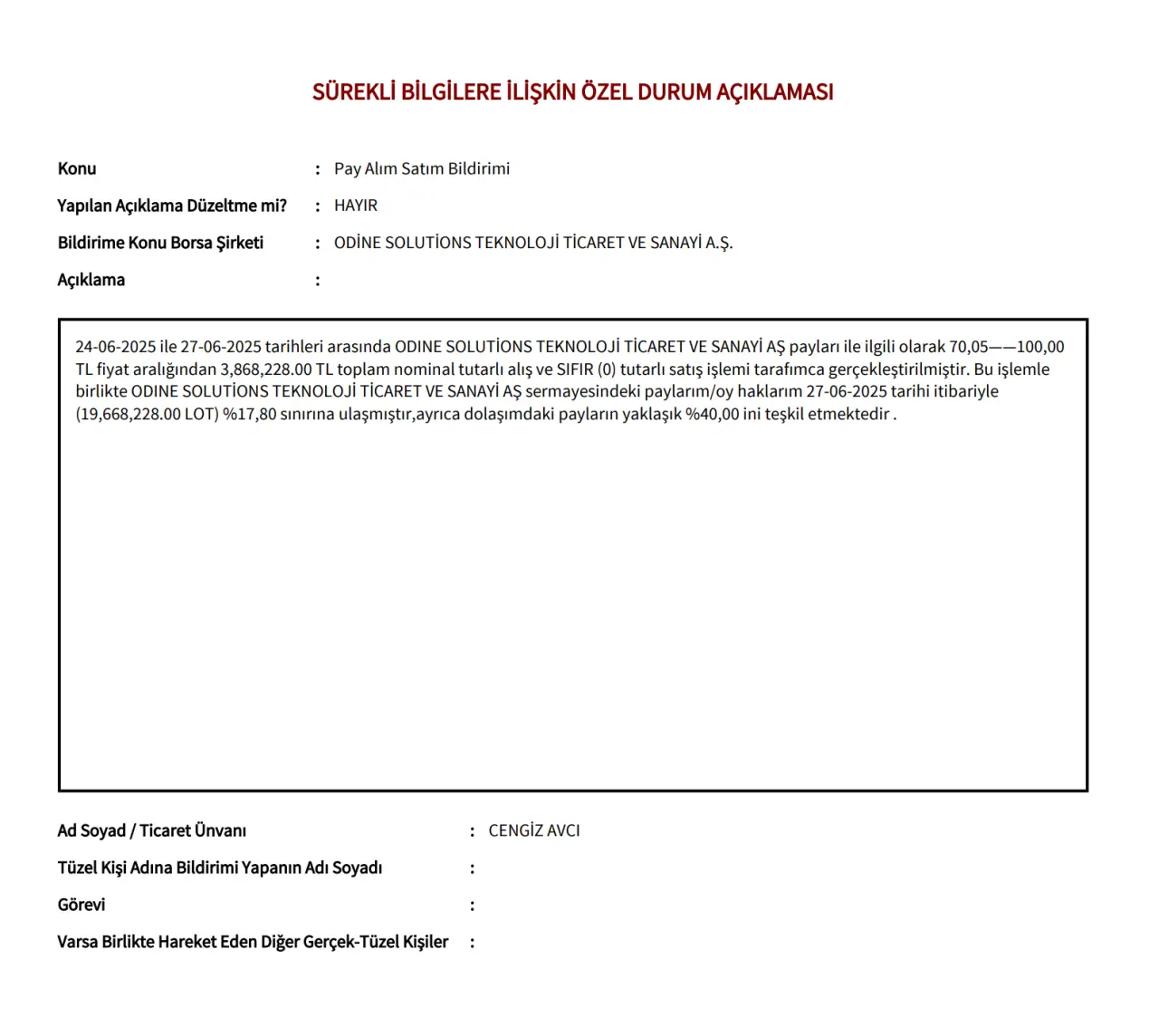 Sürekli alımlarıyla dikkat çeken Avcı, ODINE üzerindeki etkisini her geçen gün artırıyor. Yatırımcılar, bu hareketin şirket geleceği açısından nasıl bir anlam taşıyacağını yakından izliyor.