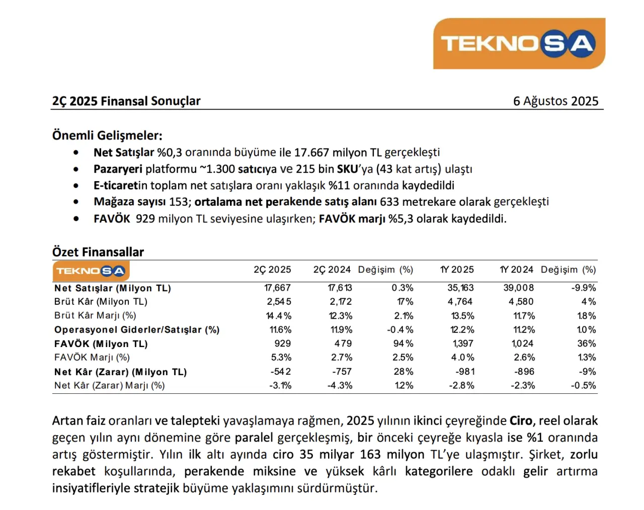 Teknosa, 2025'in ilk 6 ayında 35,1 milyar TL’lik satış yaptı. Bu satışlardan elde edilen brüt kâr 4,76 milyar TL olsa da, şirketin cebinde kâr yerine borç kaldı. Çünkü: