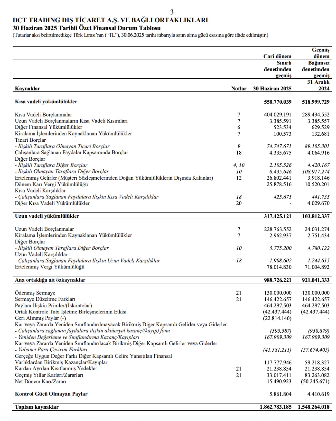 DCTTR’nin toplam yükümlülükleri 868 milyon TL’ye ulaşırken, özellikle kısa vadeli borçlar 404 milyon TL ile öne çıkıyor. Uzun vadeli borçlar ise 228 milyon TL’ye yükselerek, önceki döneme göre önemli bir artış gösterdi. Bu durum, şirketin operasyonel büyümesini borçla finanse ettiğini gösteriyor.