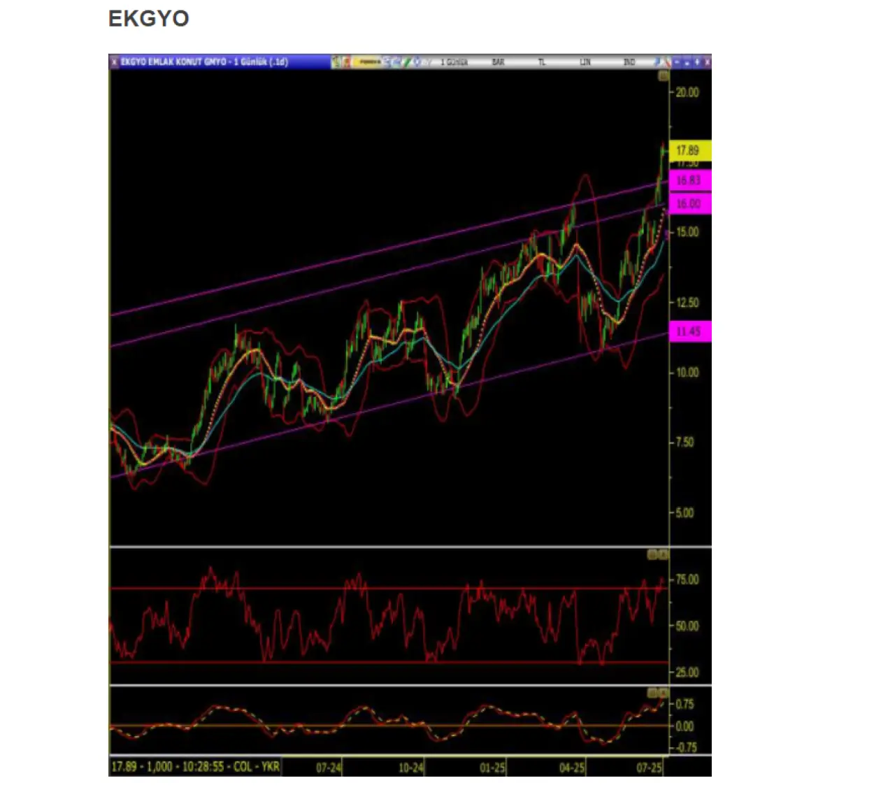 EKGYO hissesi, yükselen kanalın üst bandını kırarak yükseliş trendini sürdürmeye devam ediyor. 22 ve 50 günlük hareketli ortalamaların üzerinde fiyatlanan hisse, teknik göstergeler açısından da pozitif bir tablo sunuyor. Günlük grafikte genel olarak yukarı yönlü hareketlerin hakim olması, bu yükselişin temelini güçlendiriyor.Analistler, tepki alımlarının devam etmesi durumunda hissenin ilk hedefinin Bollinger üst bandına denk gelen 18,20 seviyesinde kalıcılık sağlaması olduğunu belirtiyor.