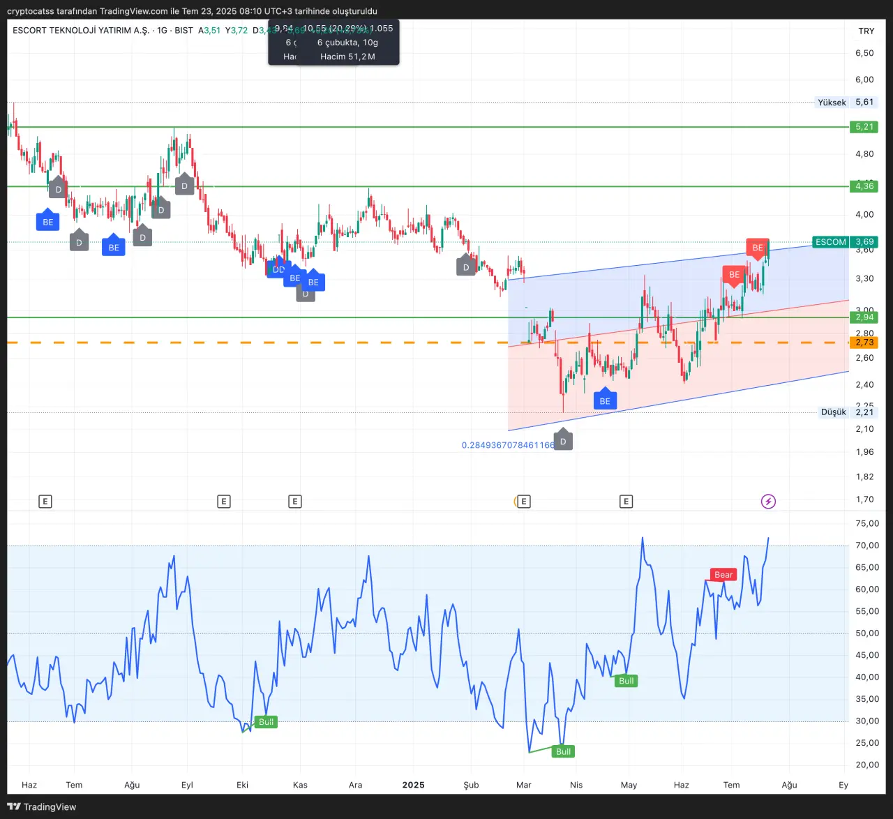 Escort Teknoloji Yatırım A.Ş. (ESCOM) hissesi, 23 Temmuz 2025 tarihli işlemlerde 3,69 TL seviyesine yükselerek son 10 günlük zirvesine ulaştı. Hisse, son dönemde oluşturduğu yükseliş kanalının üst bandını test ederken, RSI göstergesinin 70 sınırına dayanması dikkat çekti.