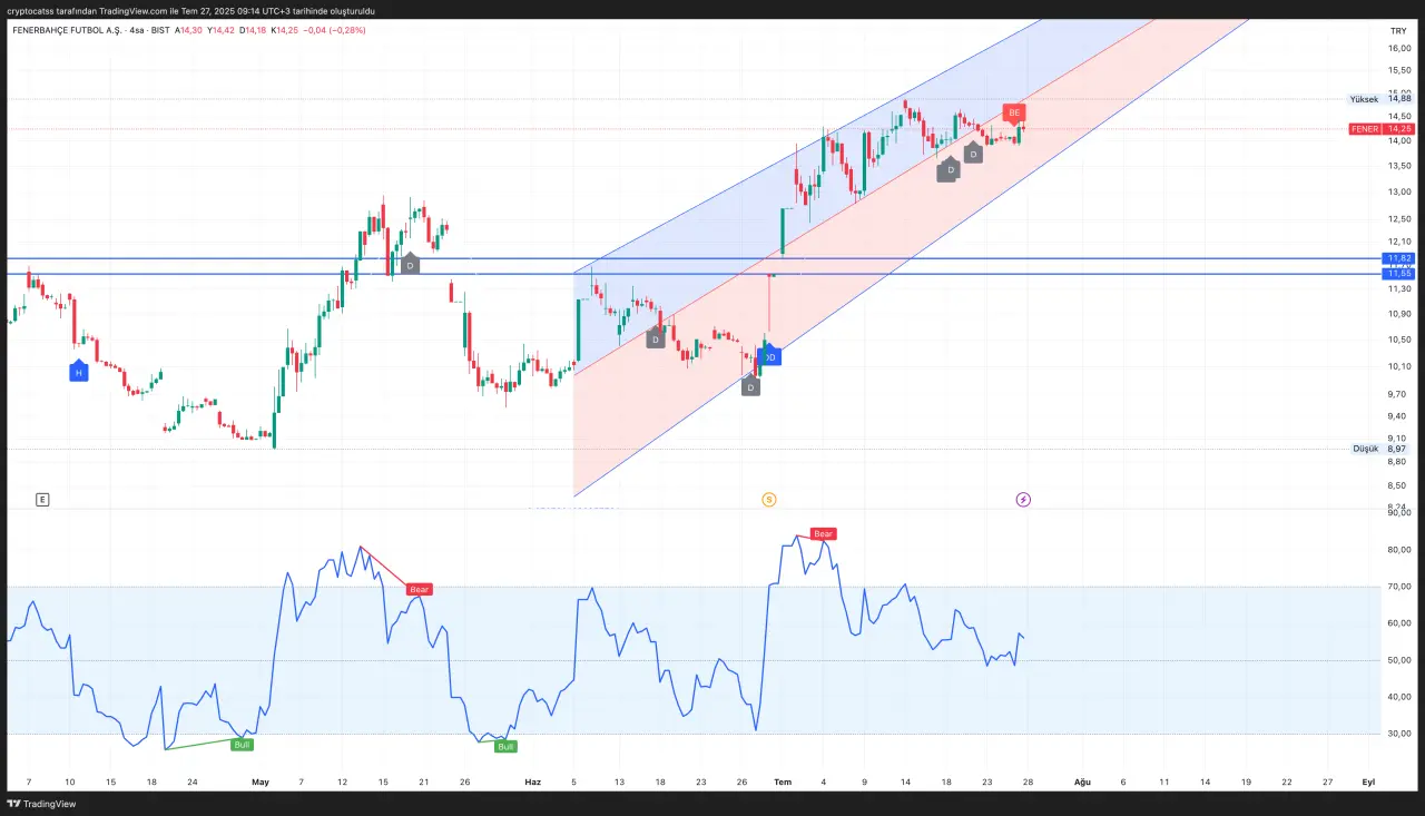 4 saatlik grafikte yükselen kanal içinde hareket eden hisse, 14,88 TL seviyesine kadar tırmandıktan sonra kanalın üst bandında satışla karşılaştı. RSI tarafında 25 Temmuz'da oluşan negatif uyumsuzluk (bearish divergence) ise momentumun zayıfladığına işaret ediyor.