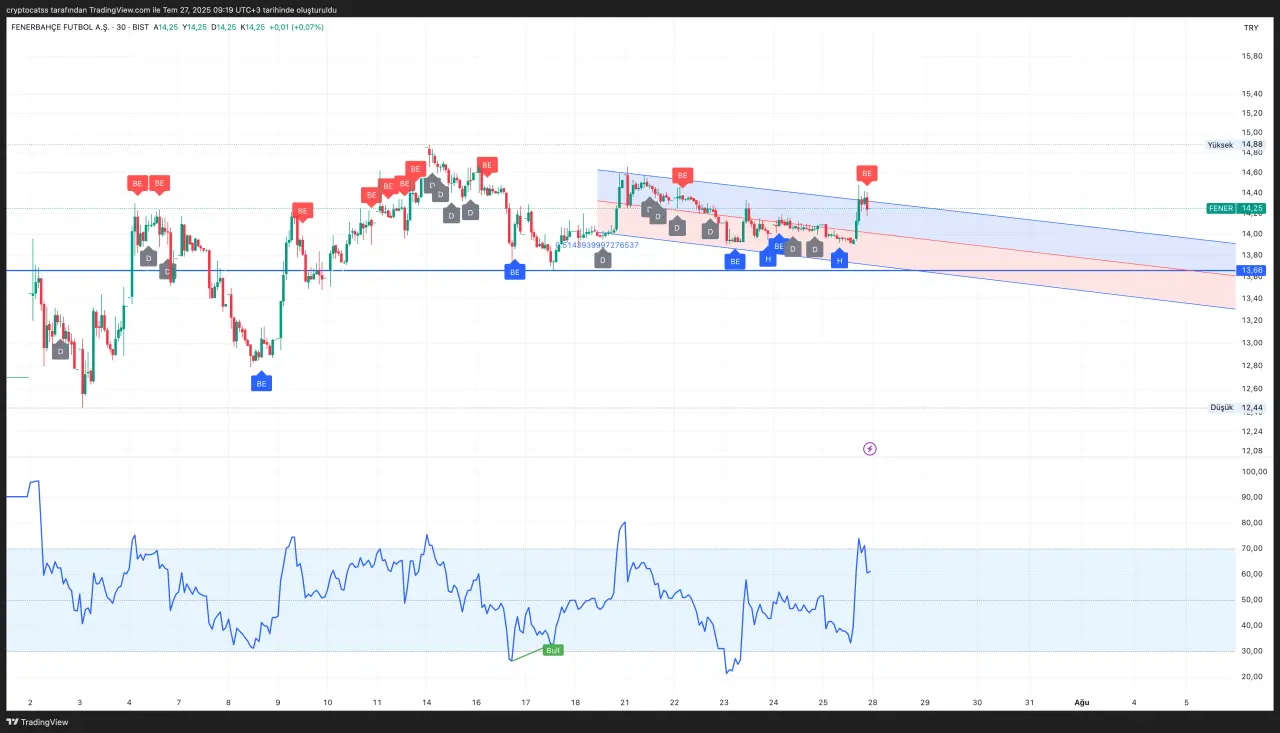 FENER hissesi, resmi haberden günler önce başlayan yükselişiyle dikkat çekti. Teknik olarak momentum zayıflarken, doldurulmamış bir GAP bölgesi hâlen baskı unsuru olarak kalıyor. Hissede 13,80 TL altında kalıcı bir kırılma yaşanırsa, yatırımcıların gözleri 11,55 TL destek bölgesine çevrilebilir.