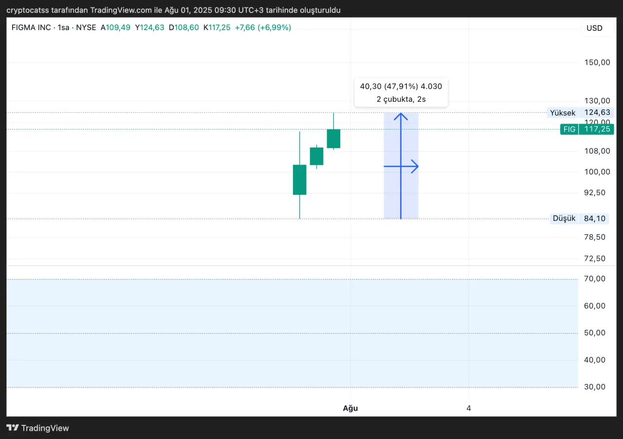 Tasarım yazılımlarıyla tanınan ABD merkezli Figma, 31 Temmuz 2025 tarihinde New York Borsası'nda “FIG” koduyla halka arz edildi. 33 dolarlık halka arz fiyatıyla yatırımcılara sunulan hisseler, ilk işlem gününde 124,63 dolara kadar yükseldi. Kapanışı ise 115,50 dolardan gerçekleştiren Figma, yatırımcısına ilk günden yaklaşık %250 oranında kazanç sağladı.