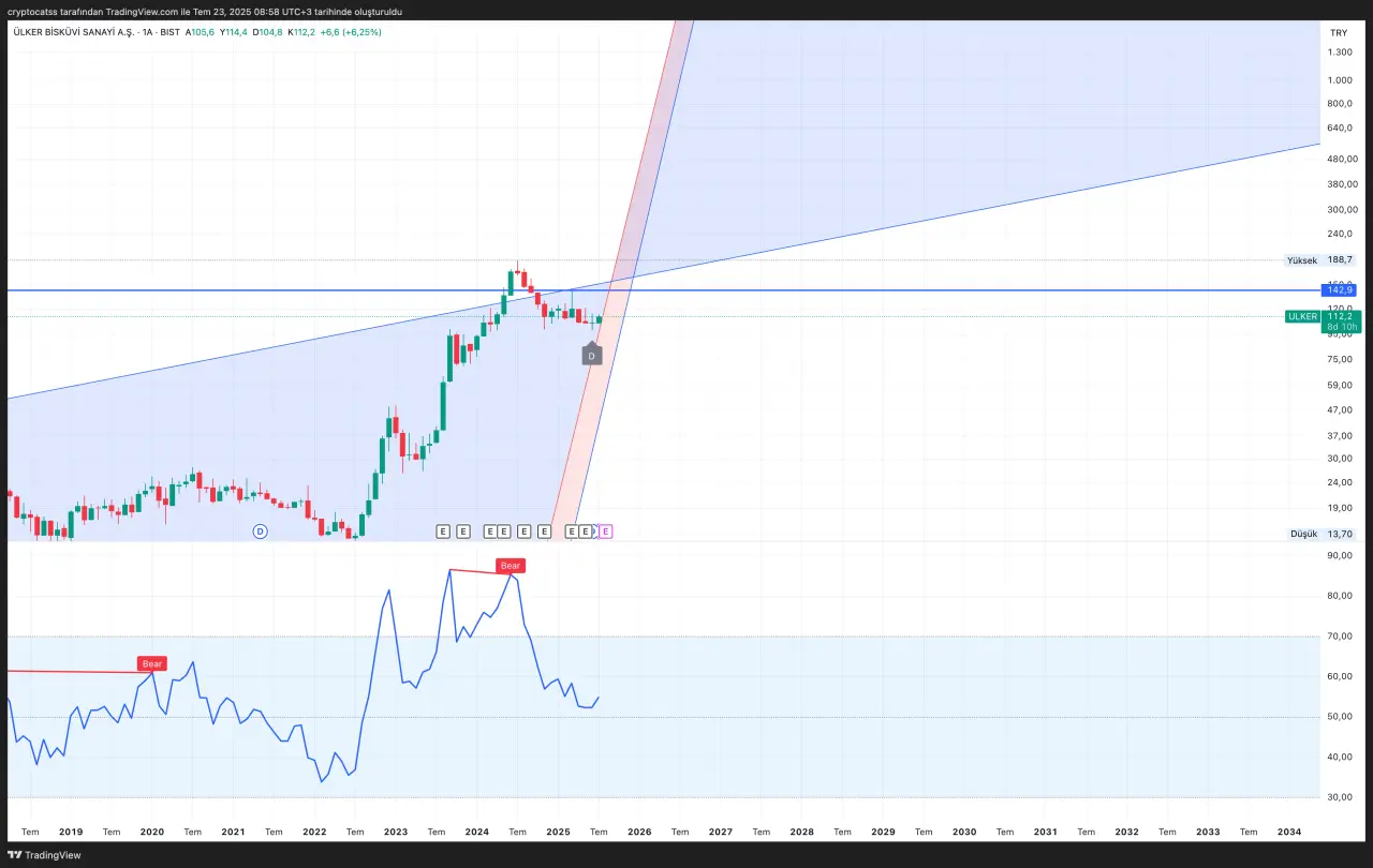 TradingView üzerinde aylık bazda hazırlanan logaritmik grafikte, ULKER hissesi uzun vadeli yükselen kanalın alt bandından güçlü bir tepki almış durumda. Teknik göstergeler, hisse fiyatının 105 TL seviyelerinde taban oluşturduğunu ve yeniden yukarı yönlü hareketlenme potansiyeli taşıdığını işaret ediyor.