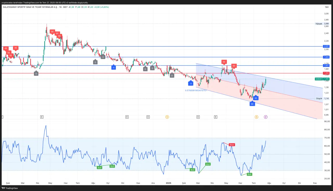 Galatasaray Sportif Sınai ve Ticari Yatırımlar A.Ş. (GSRAY), Borsa İstanbul’da uzun süredir devam eden düşen trendini kırma eşiğine gelmiş durumda. Son haftalarda artan işlem hacmi ve teknik göstergelerdeki pozitif ayrışma, hisse üzerinde yeni bir fiyatlama sürecinin başladığını gösteriyor. 26 Temmuz 2025 tarihli işlem gününde %6,93 yükselişle 1,43 TL seviyesinden kapanan GSRAY, teknik olarak kritik bir direnç seviyesine yaklaşmış bulunuyor.